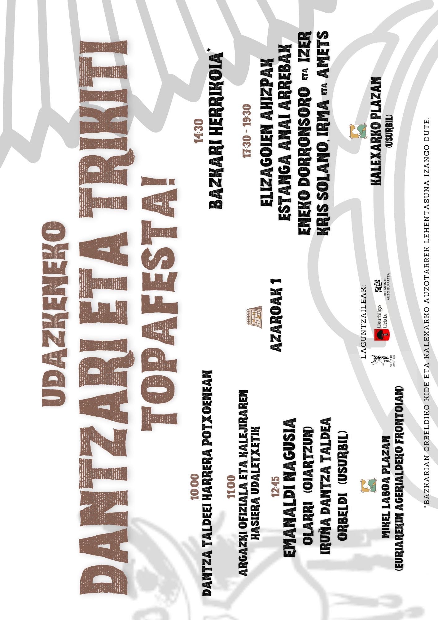 12:45 eta 17:30 Mikel Laboa plaza eta Kalezarren 10:00 Dantza taldeei harrera Potxoenean. 11:00 Argazki Ofiziala eta kalejiraren hasiera Udaletx...
